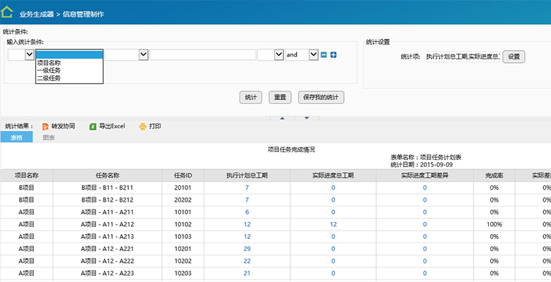 支持任务管理相关信息的查询和报表统计,可根据实际需要调整修改。