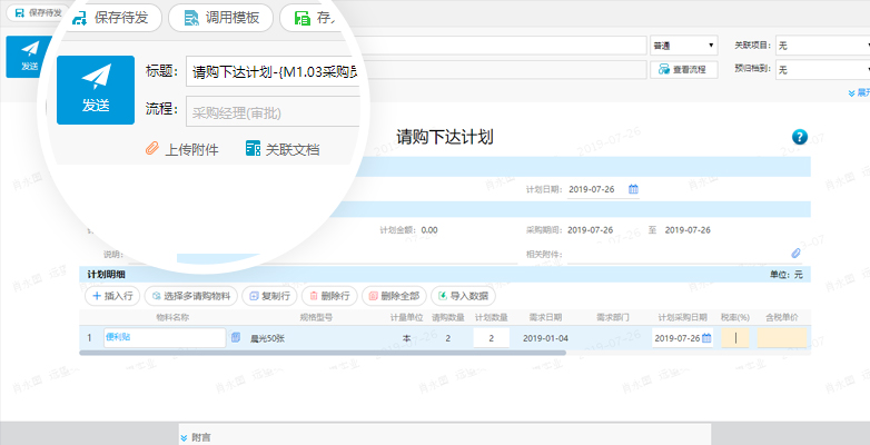 采购部门可发起采购申请、采购计划,并生成请购档案、采购计划档案。